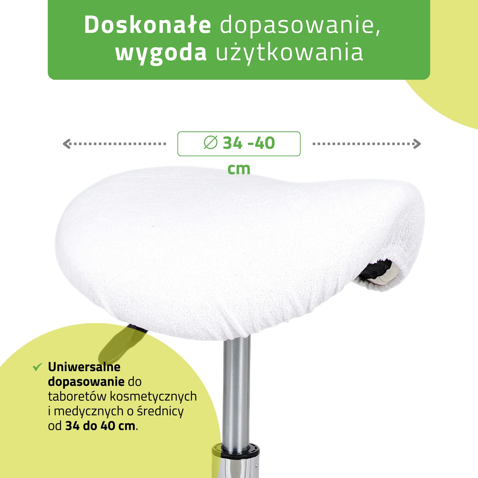 Pokrowiec został zaprojektowany z myślą o szerokim zastosowaniu w profesjonalnych gabinetach. Dzięki elastycznej gumce idealnie dopasowuje się do siedzisk taboretów o średnicy od 34 do 40 cm.