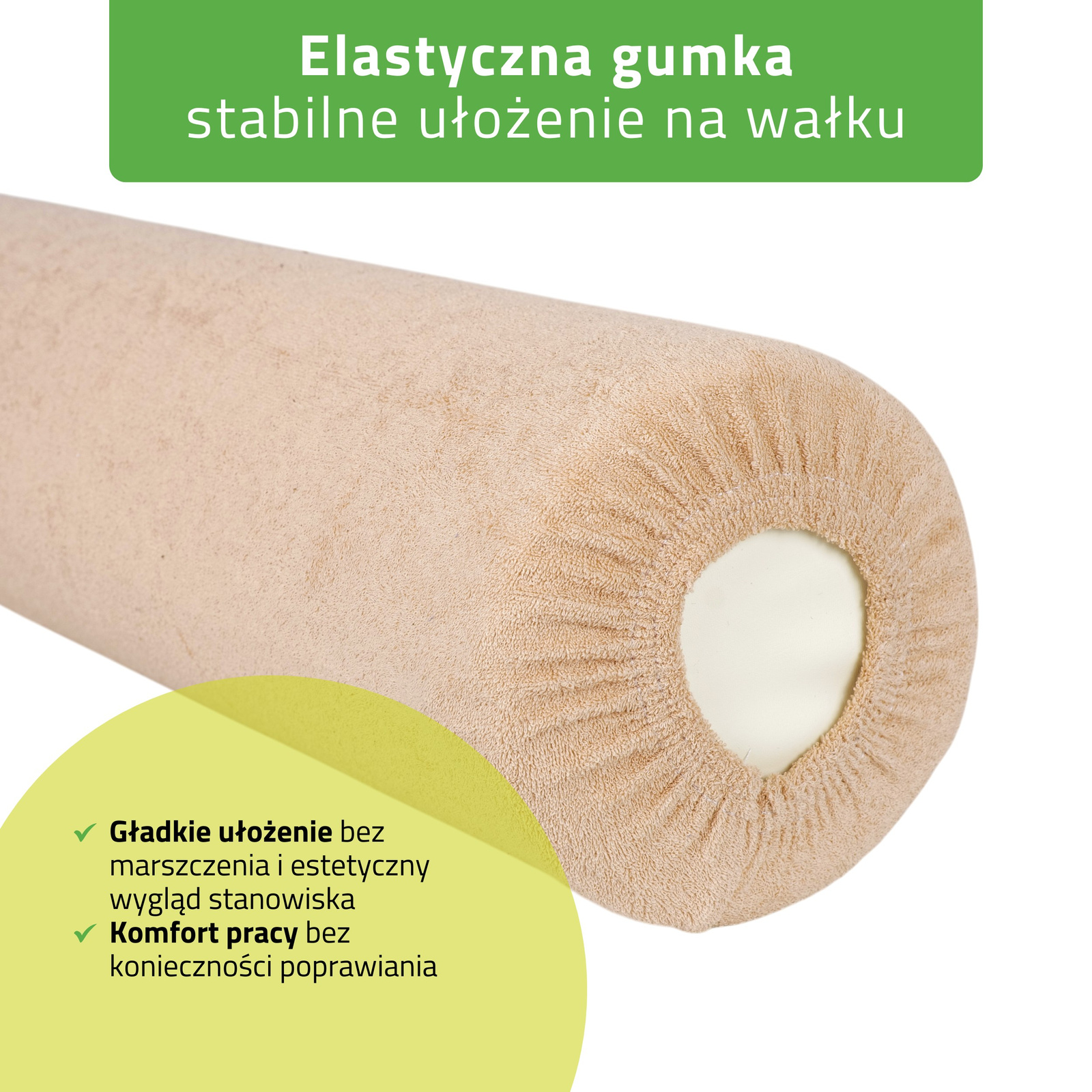 Elastyczna gumka umożliwia szybkie zakładanie prześcieradła na wałek i pewne dopasowanie do jego powierzchni.