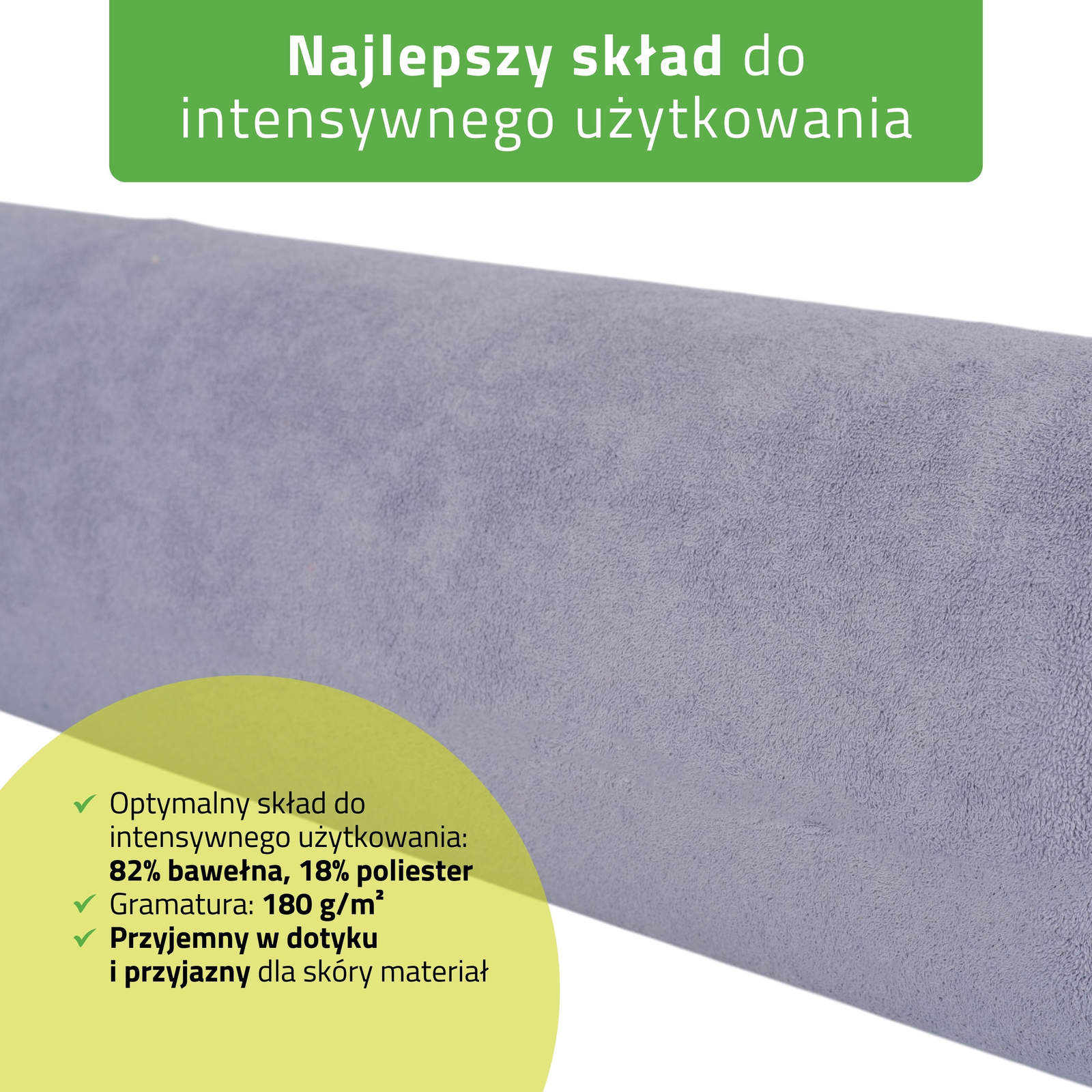 Dzianina frotte o gramaturze 180 g/m² zapewnia optymalny balans pomiędzy komfortem użytkowania a trwałością.