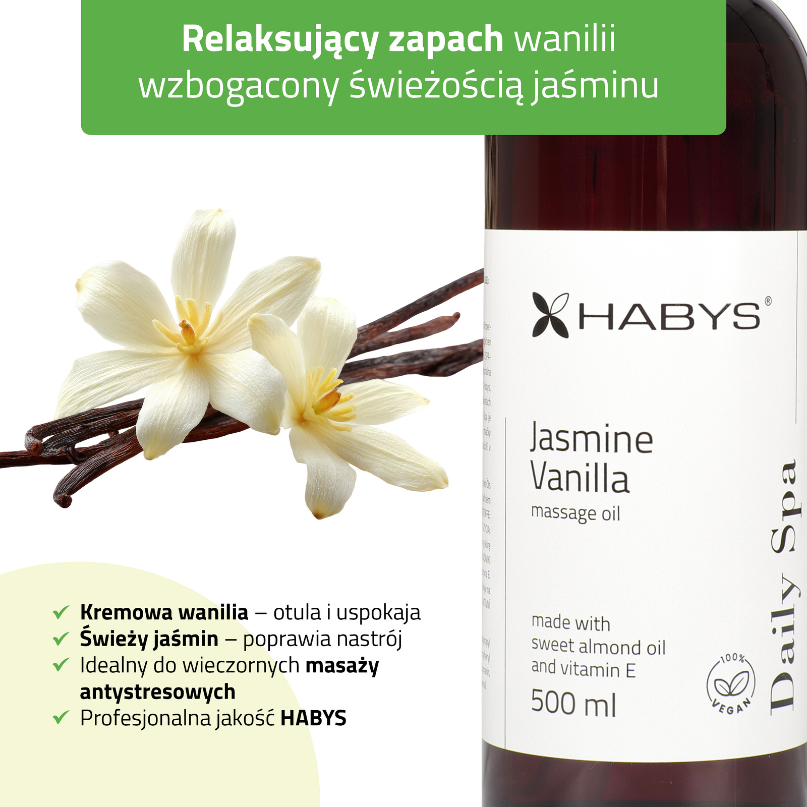 Relaksujący olejek do masażu z naturalnym olejem migdałowym i witaminą E. Zapach jaśminu połączony z ciepłą nutą wanilii otula, wycisza i tworzy kojącą atmosferę podczas zabiegu. Idealny do profesjonalnego masażu oraz domowej pielęgnacji.