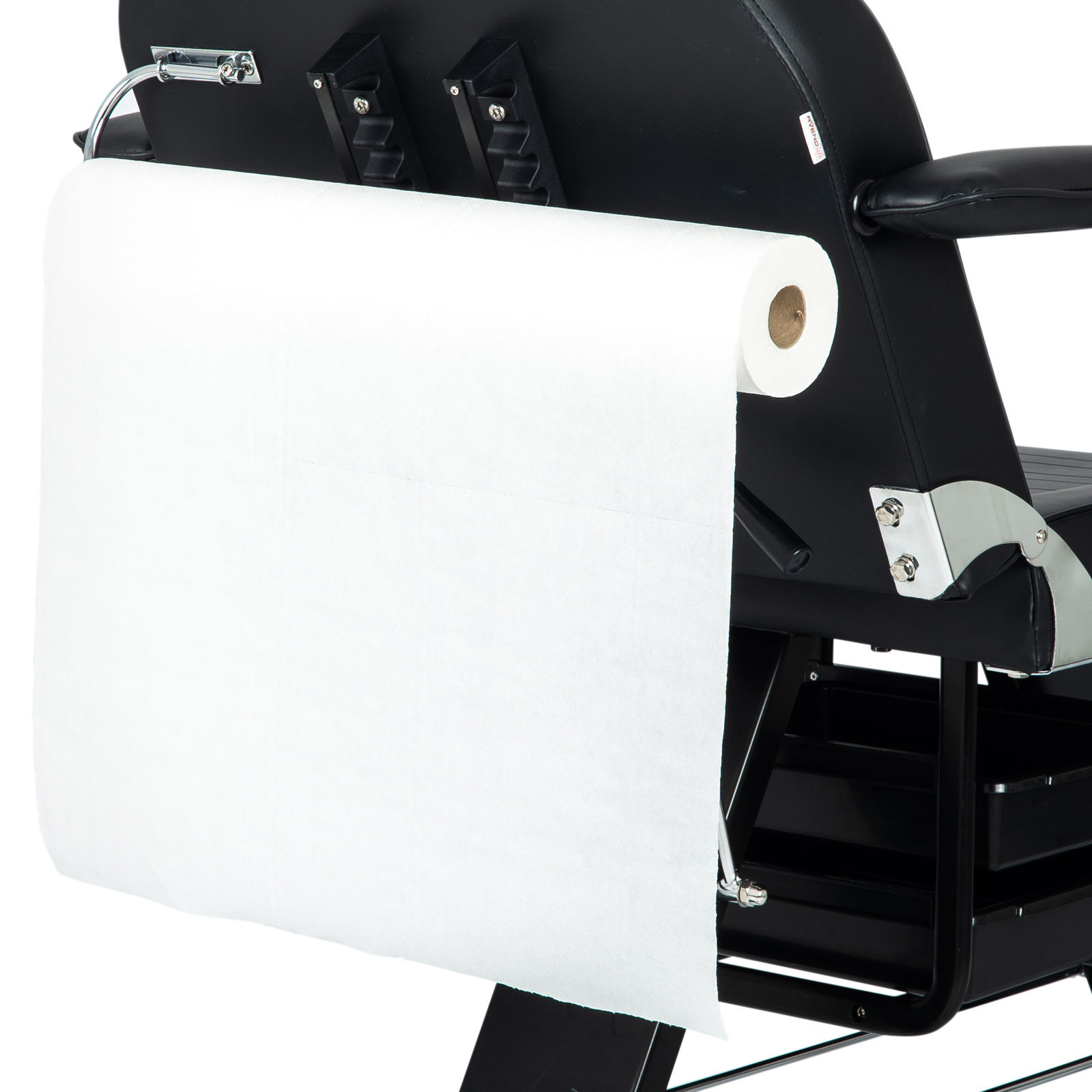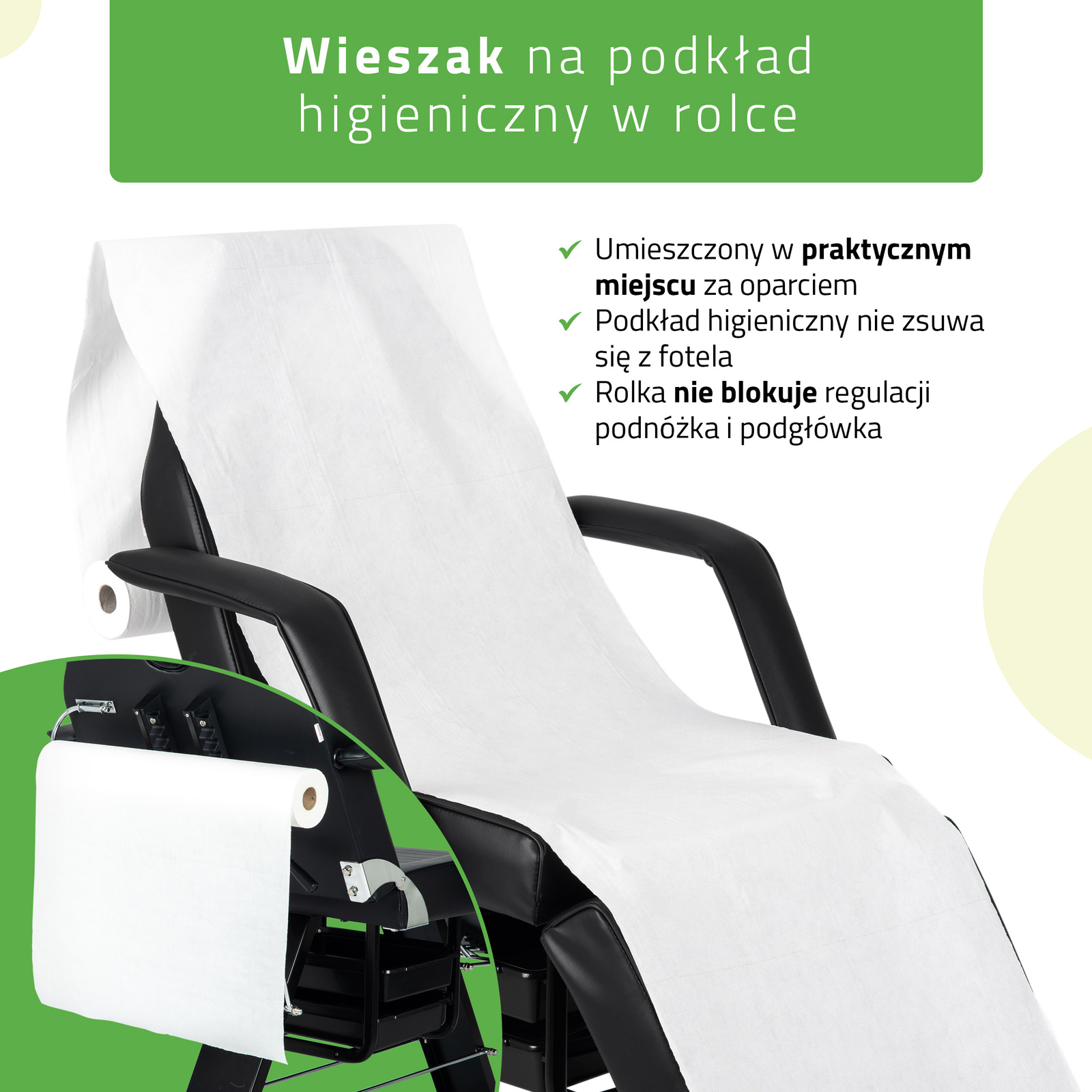 Wieszak na podkład higieniczny w rolce umieszczony w praktycznym miejscu za oparciem ułatwia pracę, nie zsuwa się z fotela i nie blokuje regulacji podnóżka.