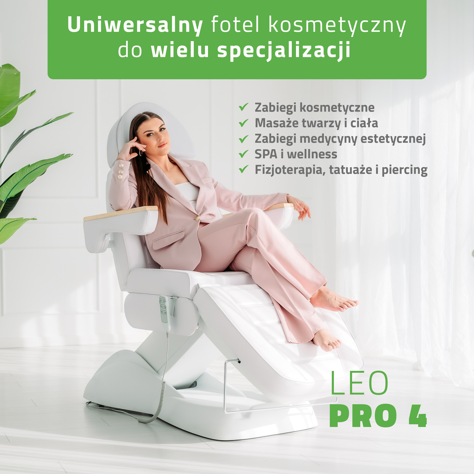 Leo PRO 4 to niezawodny elektryczny fotel kosmetyczny, który łączy nowoczesne funkcje z eleganckim wyglądem – idealny wybór dla specjalistów, którzy stawiają na profesjonalizm, wygodę i jakość.