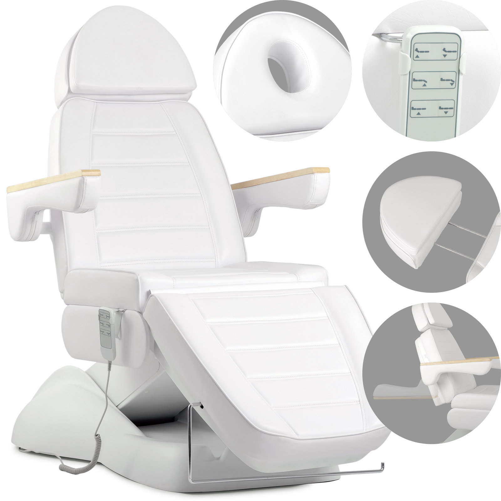 Zdejmowane i obracane podłokietniki: możliwość zdejmowania i obracania podłokietników w zakresie 180° pozwala na łatwe dostosowanie fotela do różnorodnych zabiegów oraz zapewnia swobodę ruchów zarówno klientowi, jak i specjaliście.