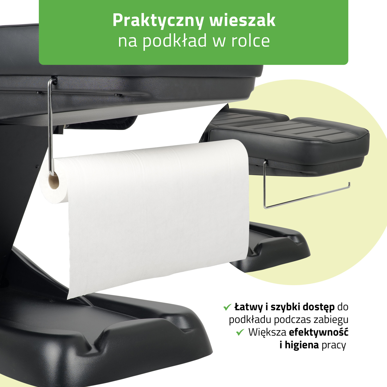 Wieszak na podkład w rolce: fotel kosmetyczny wyposażono w praktyczny wieszak, który ułatwia szybkie i wygodne korzystanie z podkładu, zwiększając efektywność i higienę podczas pracy.