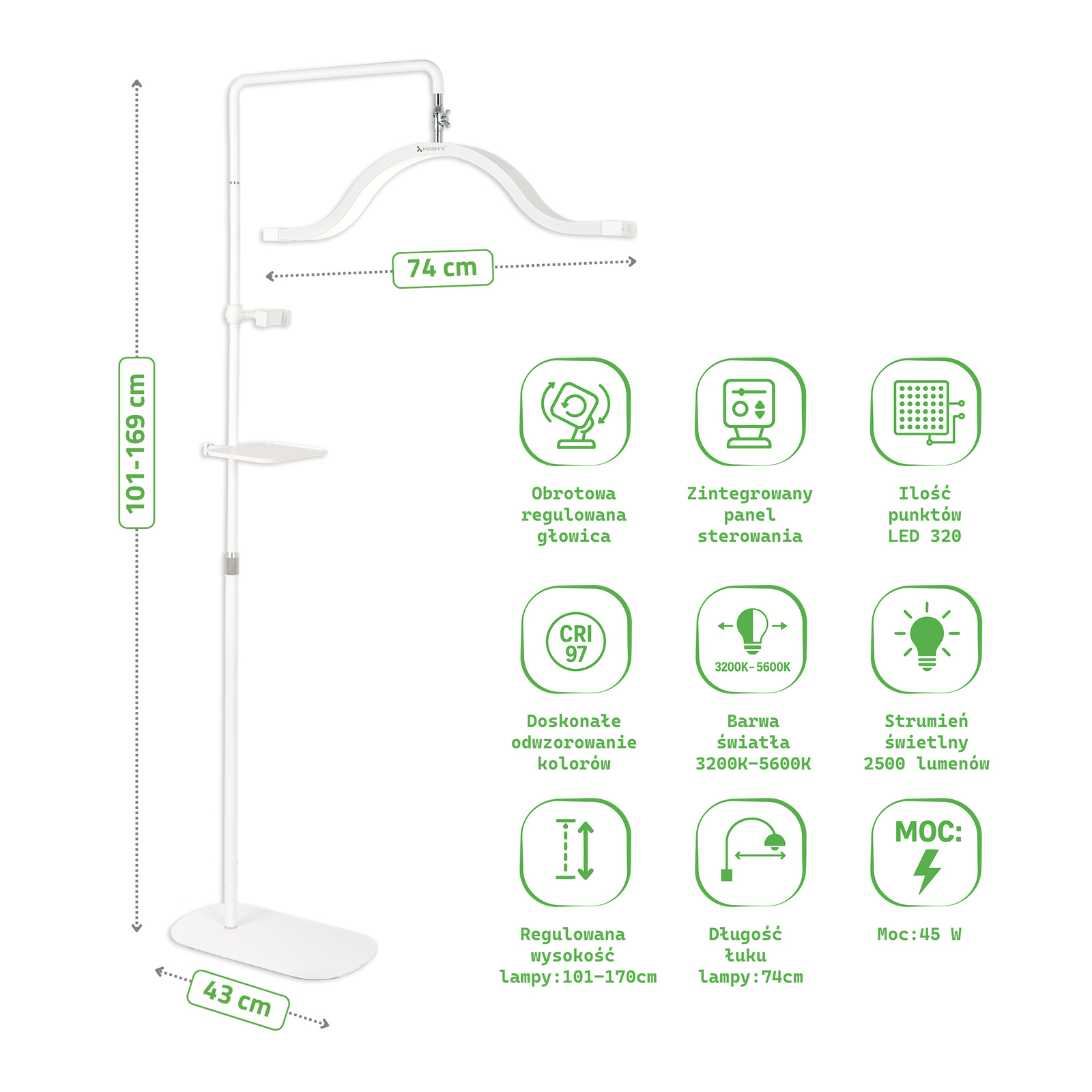 Dzięki trzem trybom barwy światła (ciepła, neutralna, zimna), płynnej regulacji jasności oraz podwójnej regulacji kąta padania światła – VENA dostosowuje się do każdego zadania i każdego wnętrza. Intuicyjny panel dotykowy pozwala w prosty sposób zarządzać parametrami lampy, a solidna konstrukcja z możliwością regulacji wysokości od 101 do 169 cm daje pełną swobodę ustawienia. Dodatkowe akcesoria zwiększają funkcjonalność lampy.