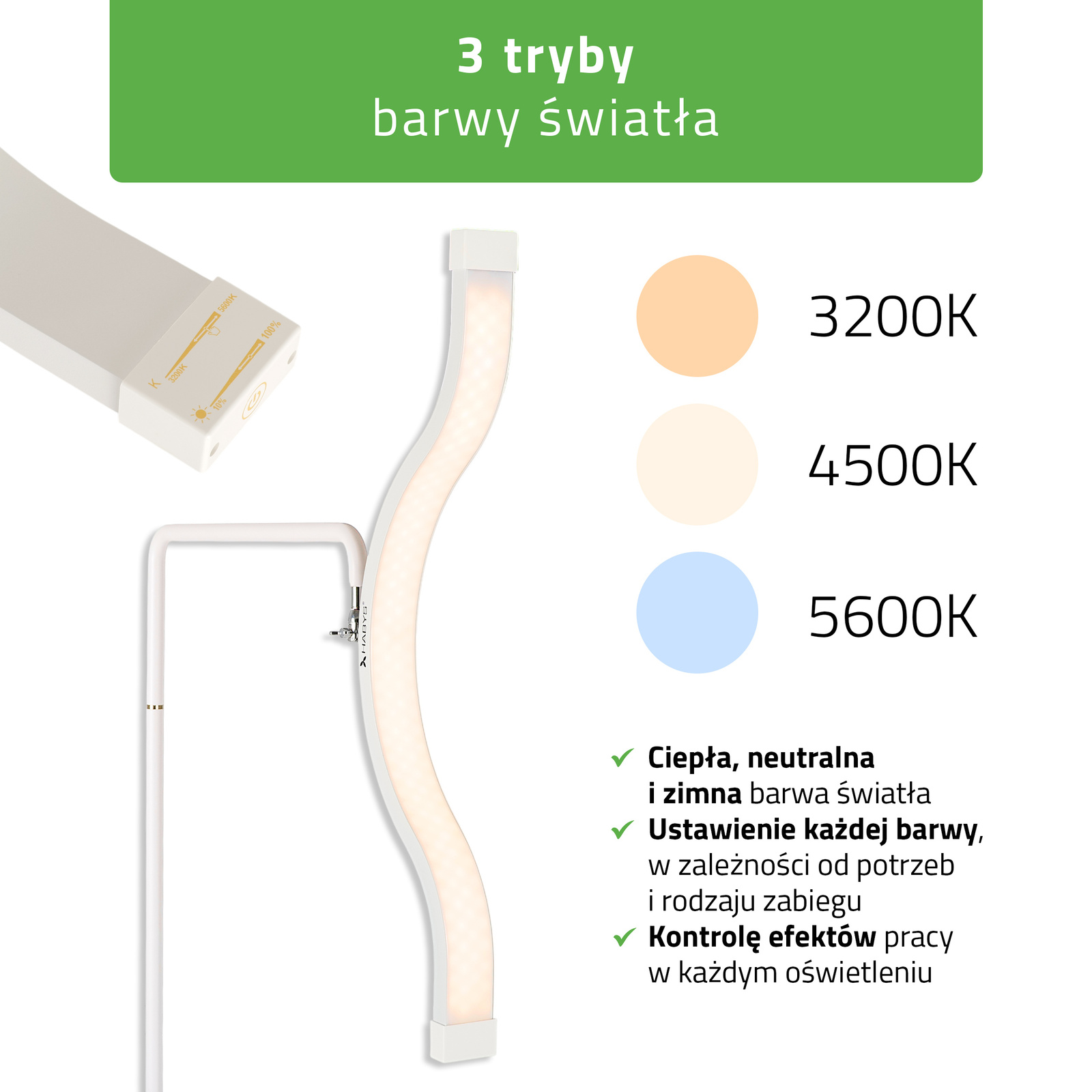 Ciepła, neutralna, zimna – pozwalają na ustawienie każdej barwy w zależności od potrzeb i rodzaju zabiegu oraz kontrolę efektów pracy w każdym oświetleniu.