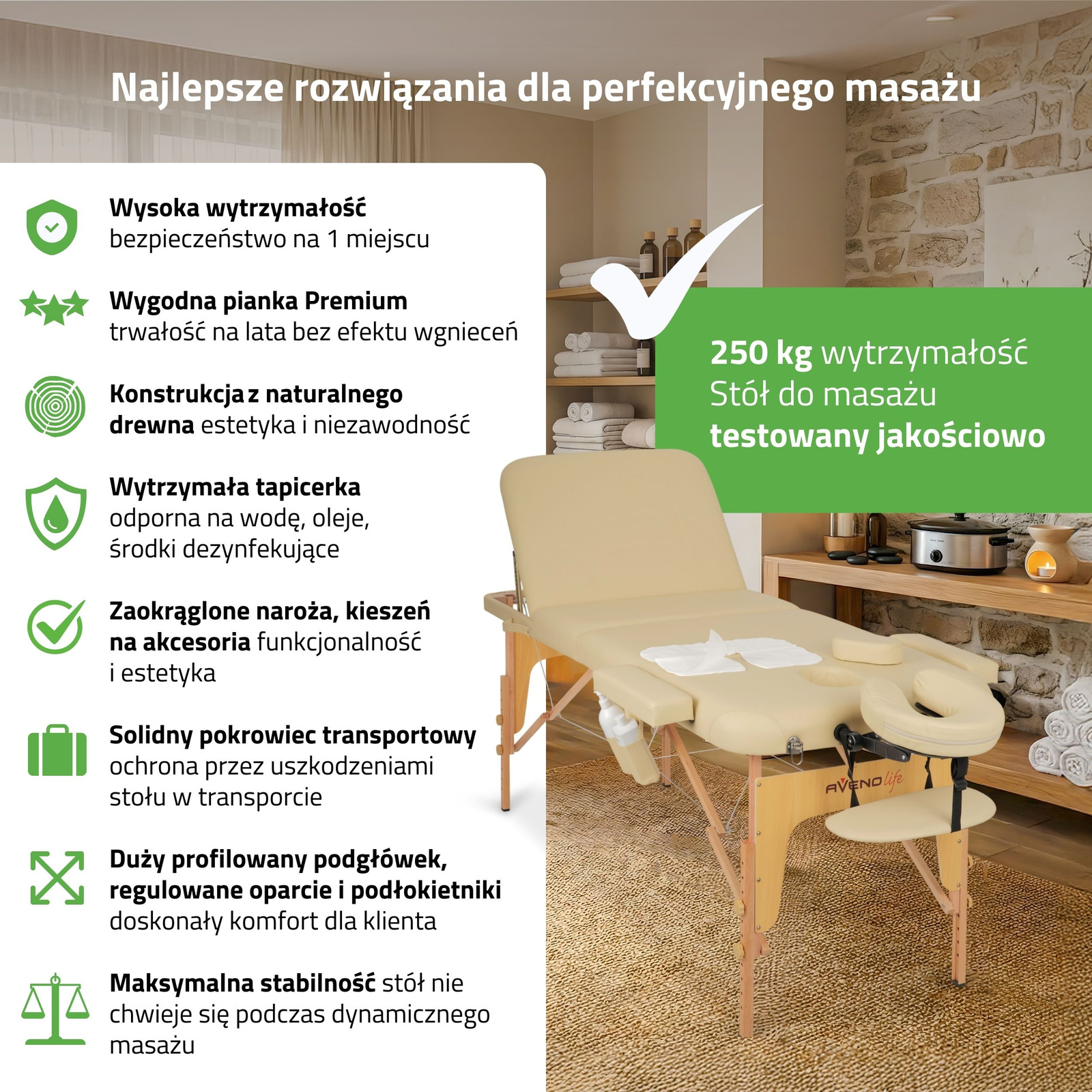 Wykonany z elementów z naturalnego drewna i wyposażony w piankę o grubości aż 5 cm, Bianca zapewnia wysoki komfort nawet podczas długich sesji terapeutycznych. Doskonale sprawdzi się w pracy gabinetowej, mobilnej – na wizytach domowych, eventach czy szkoleniach.