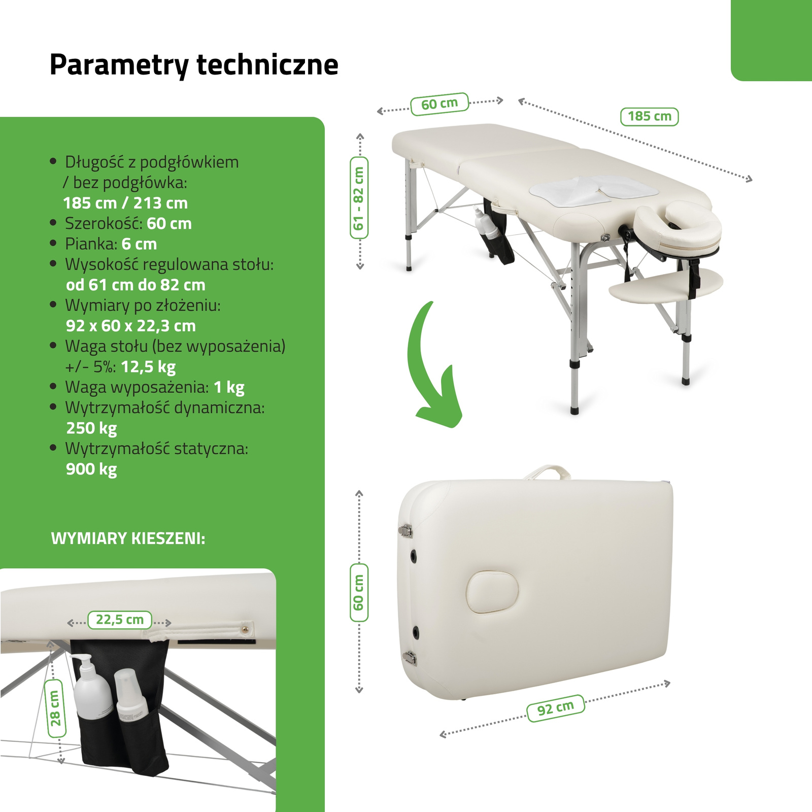 Vera to solidny, dwusegmentowy stół do masażu, zaprojektowany z myślą o specjalistach, którzy oczekują pełnej mobilności i komfortu pracy w każdej pozycji. Jego kluczowym wyróżnikiem jest aluminiowa konstrukcja w kształcie litery U, która umożliwia ergonomiczną pracę w pozycji siedzącej, zapewniając swobodne wsunięcie nóg pod blat. To szczególnie istotne podczas masażu twarzy, terapii manualnej czy refleksologii.