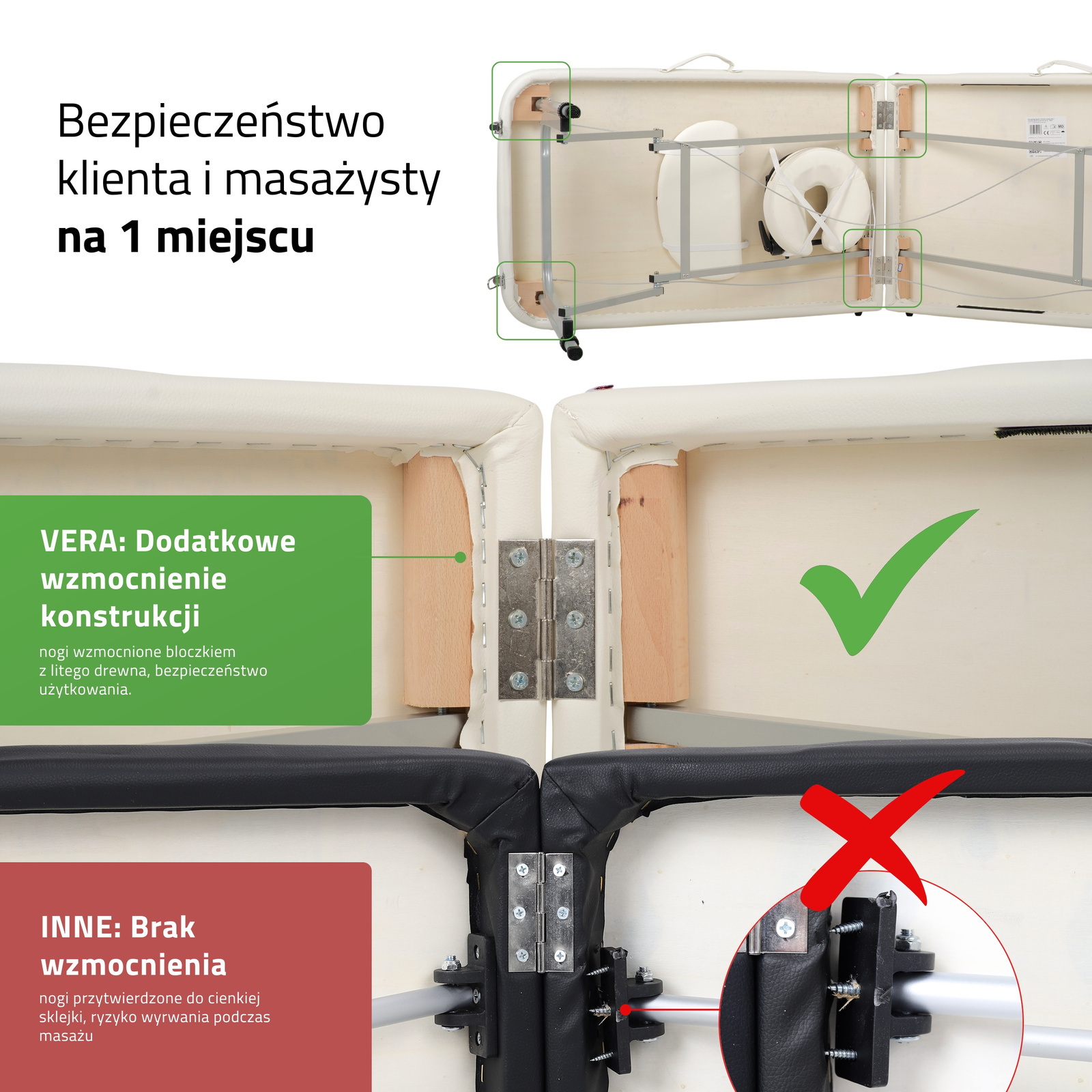 • Vera to solidny, dwusegmentowy stół do masażu, zaprojektowany z myślą o specjalistach, którzy oczekują pełnej mobilności i komfortu pracy w każdej pozycji.