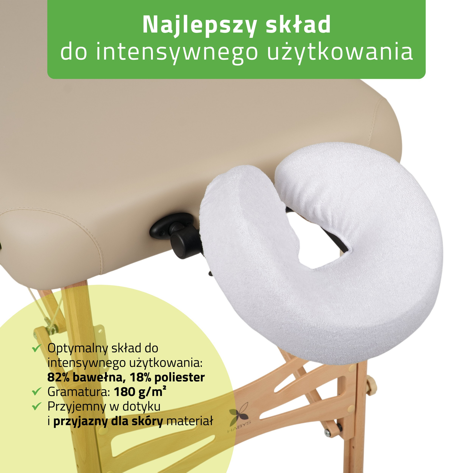 Pokrycie frotte dedykowane podgłówkom do stołów składanych sprawdza się w codziennej pracy masażystów, fizjoterapeutów i kosmetologów. Wykonane z wytrzymałej dzianiny frotte, łączy miękkość z trwałością i łatwą pielęgnacją.