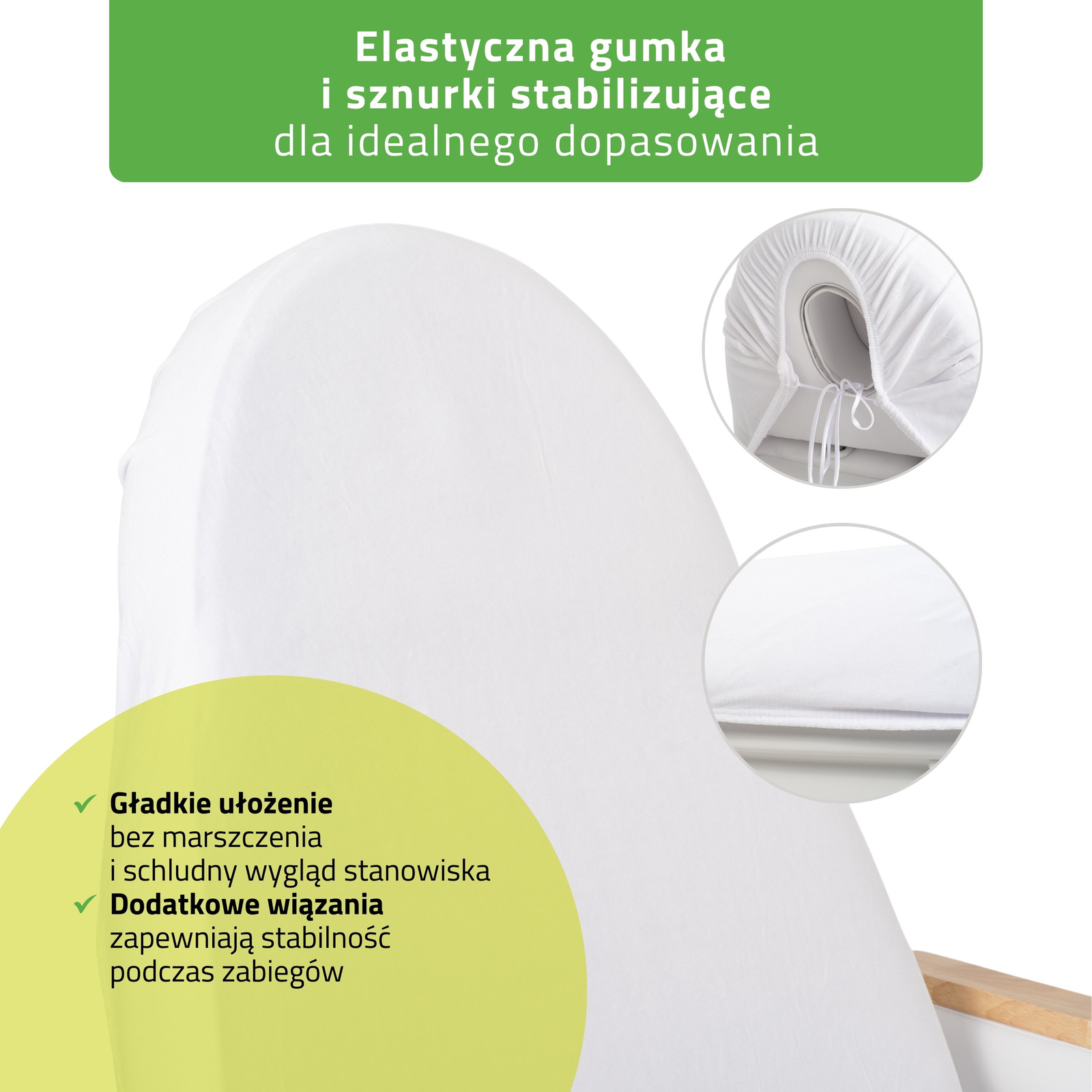 Elastyczna gumka umożliwia szybkie zakładanie prześcieradła i równomierne dopasowanie do powierzchni fotela lub łóżka. Dodatkowe sznurki pozwalają na lepsze dopasowanie, szczególnie w okolicach zagłówka, i pomagają utrzymać prześcieradło w jednej pozycji przez cały zabieg.