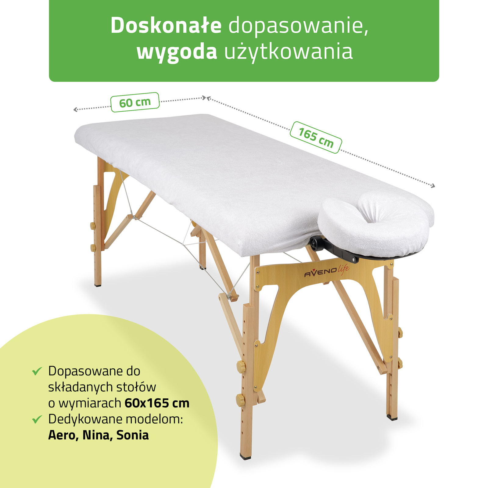 - 1-częściowe prześcieradło frotte z gumką – dopasowane do stołów o wymiarach 60x165 cm (modele Aero, Nina, Sonia)