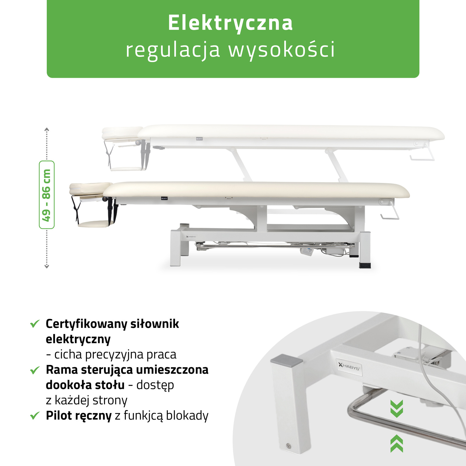 Elektryczna regulacja wysokości: Stół rehabilitacyjny Fortis 1 wyposażony jest w cichy, certyfikowany siłownik elektryczny, który umożliwia precyzyjną regulację wysokości w zakresie od 49 cm do 86 cm.