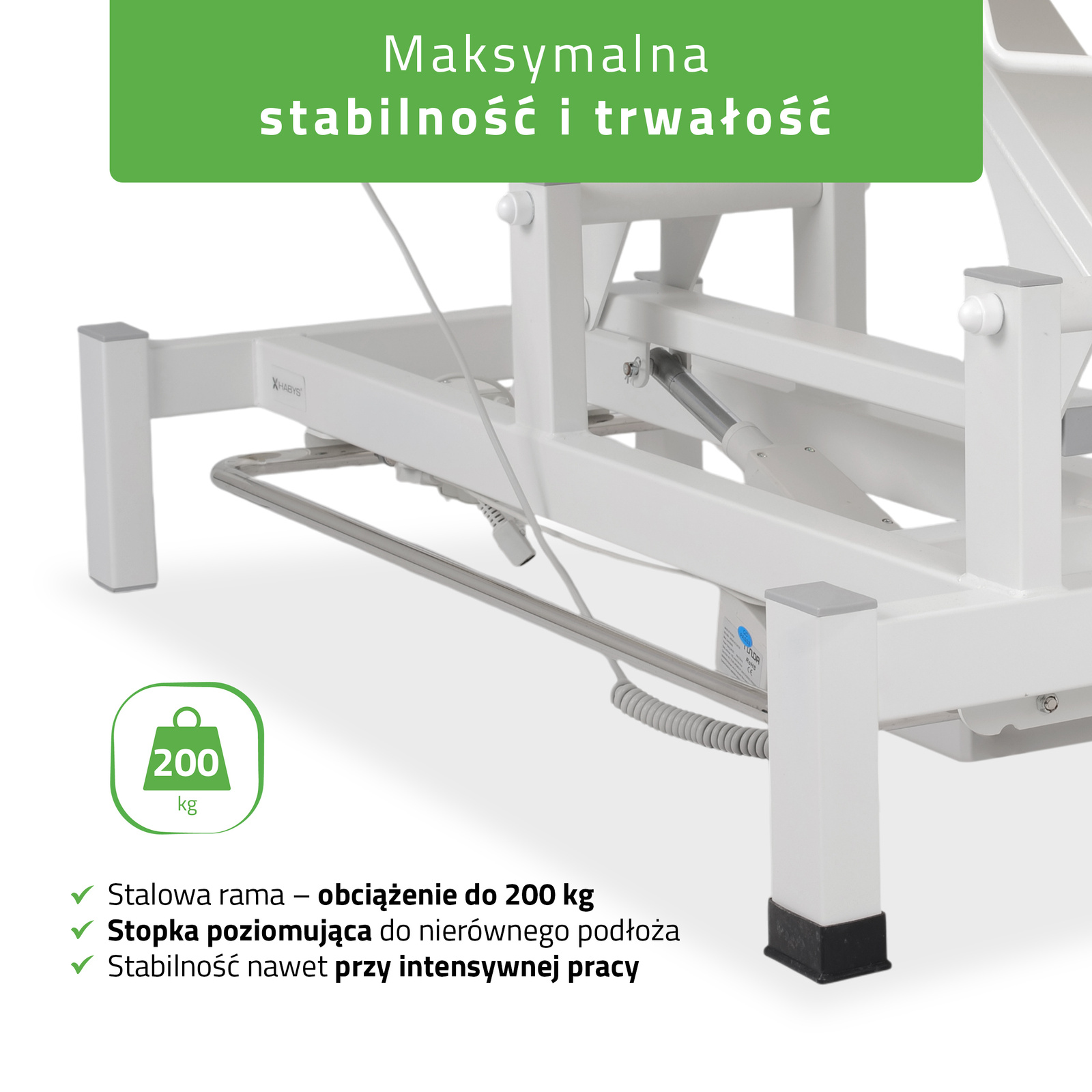 Wytrzymała konstrukcja: Solidna rama stołu zapewnia maksymalną nośność na poziomie 200 kg. Dzięki temu stół do masażu Fortis 1 jest stabilny, bezpieczny i odporny na drgania oraz przesunięcia podczas zabiegów.