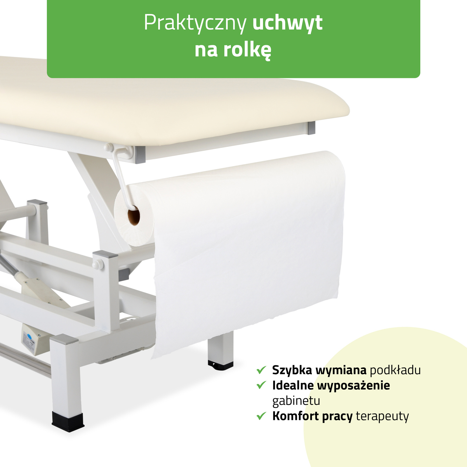 Uchwyt na podkład higieniczny w rolce: Uchwyt ten dodatkowo podnosi funkcjonalność stołu w codziennym użytkowaniu, sprawiając, że niezbędne akcesoria są zawsze pod ręką. Uchwyt dopasowany jest do podkładów w rolce o szerokości 60 cm.