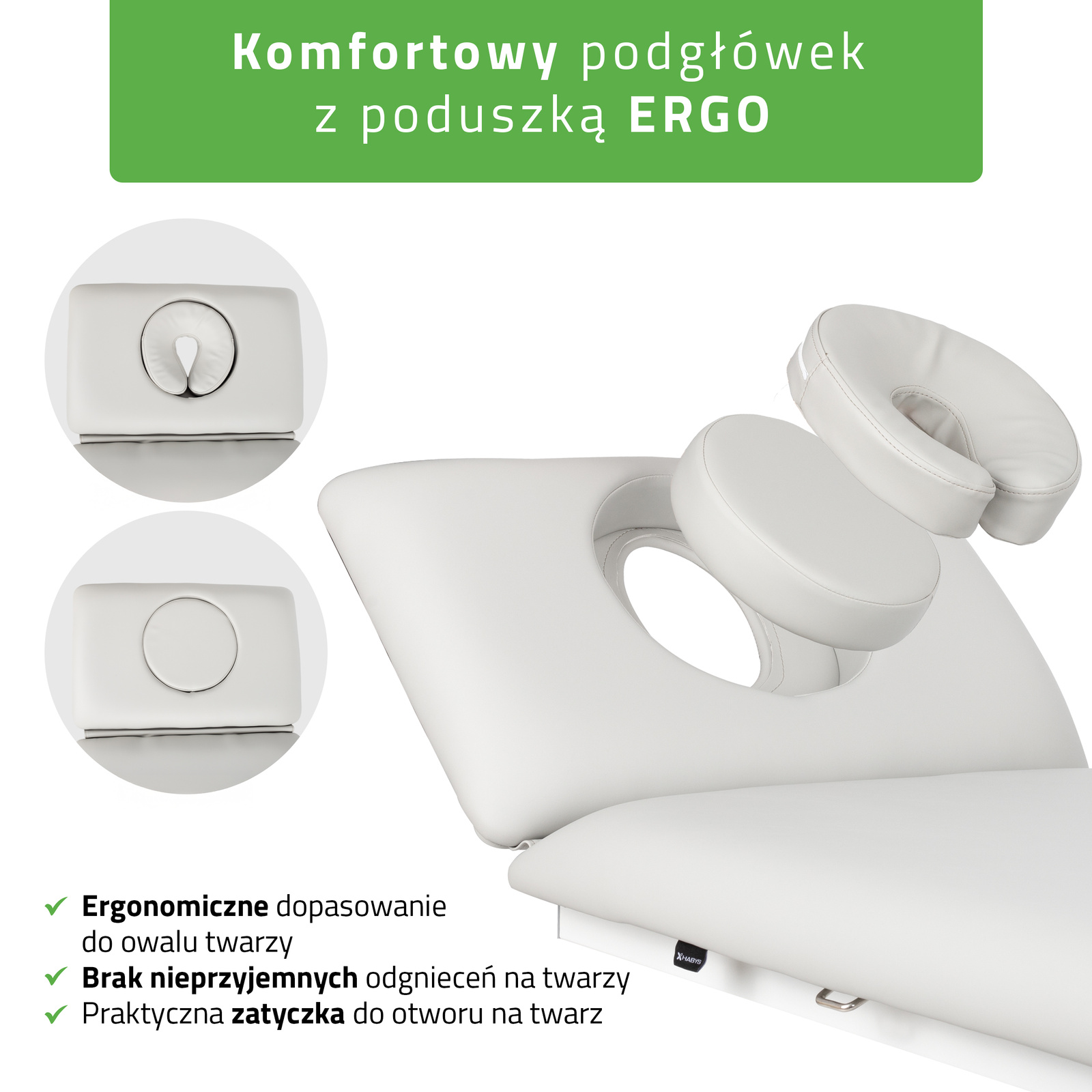 Podgłówek z poduszką ERGO: Regulacja kąta nachylenia podgłówka oraz mechanizm sprężyn gazowych zapewnia ciche i precyzyjne dostosowanie pozycji pacjenta do potrzeb w terapii. Poduszka Ergo odpowiednio miękka i komfortowa, specjalnie wyprofilowana i dopasowana do owalu twarzy zapewnia doskonały komfort dla pacjenta nawet podczas długiej terapii czy masażu.