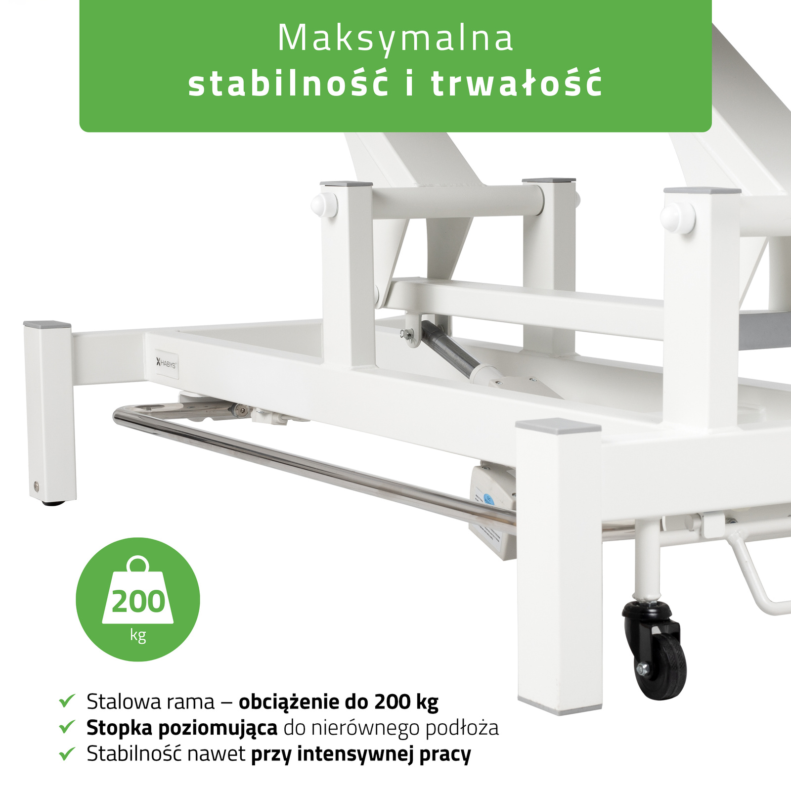 Wytrzymała konstrukcja: Zwiększona wytrzymałość ramy sprawia, że dopuszczalne obciążenie stołu wynosi 200 kg, co pozwala na bezpieczne użytkowanie nawet przy większym obciążeniu. Dzięki stabilnej konstrukcji stół jest odporny na drgania i przesunięcia podczas zabiegów.