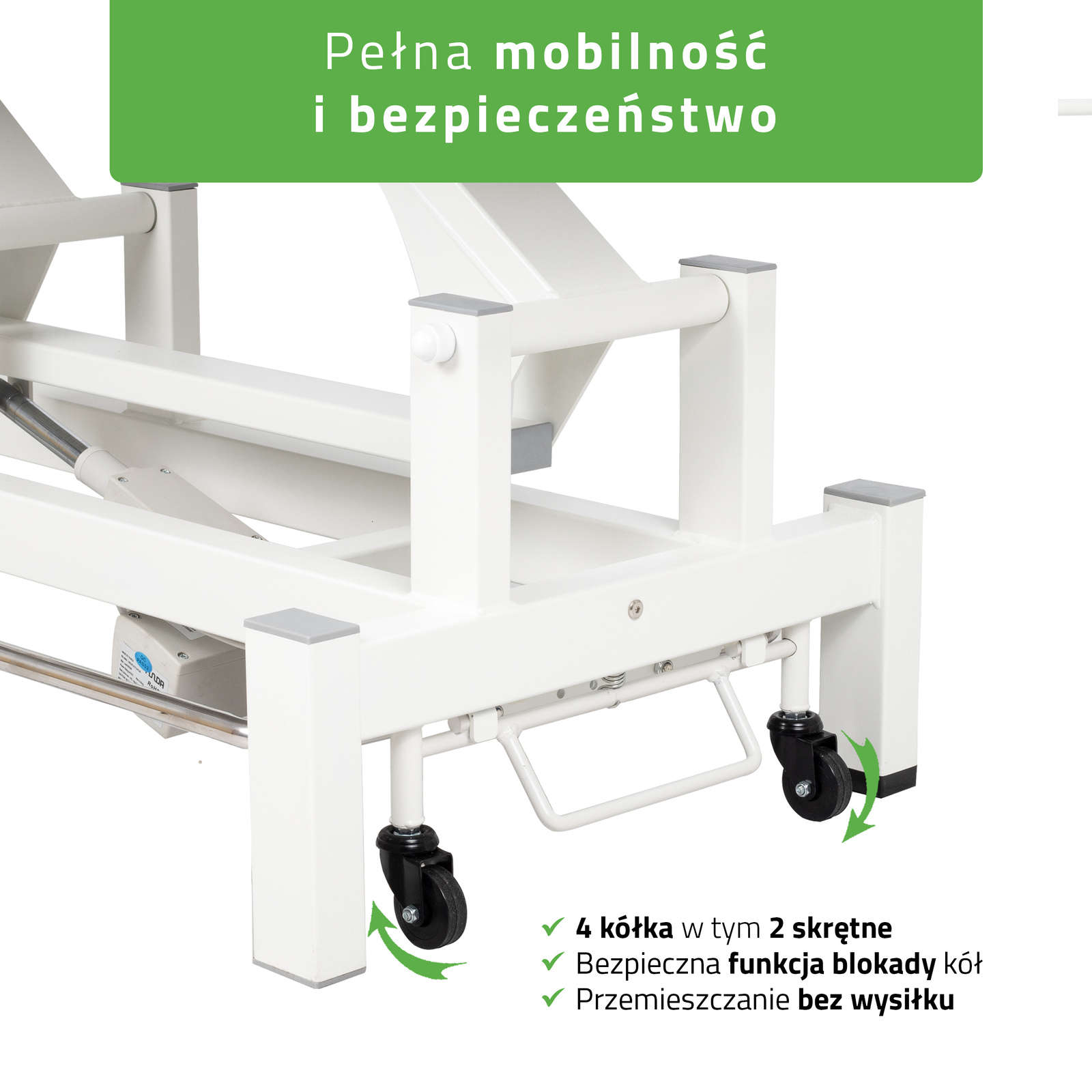 Rama sterująca: Rama sterująca umieszczona z obu stron stołu pozwala na wygodną regulację wysokości stopą. Dzięki temu terapeuta może pracować manualnie bez przerywania terapii.