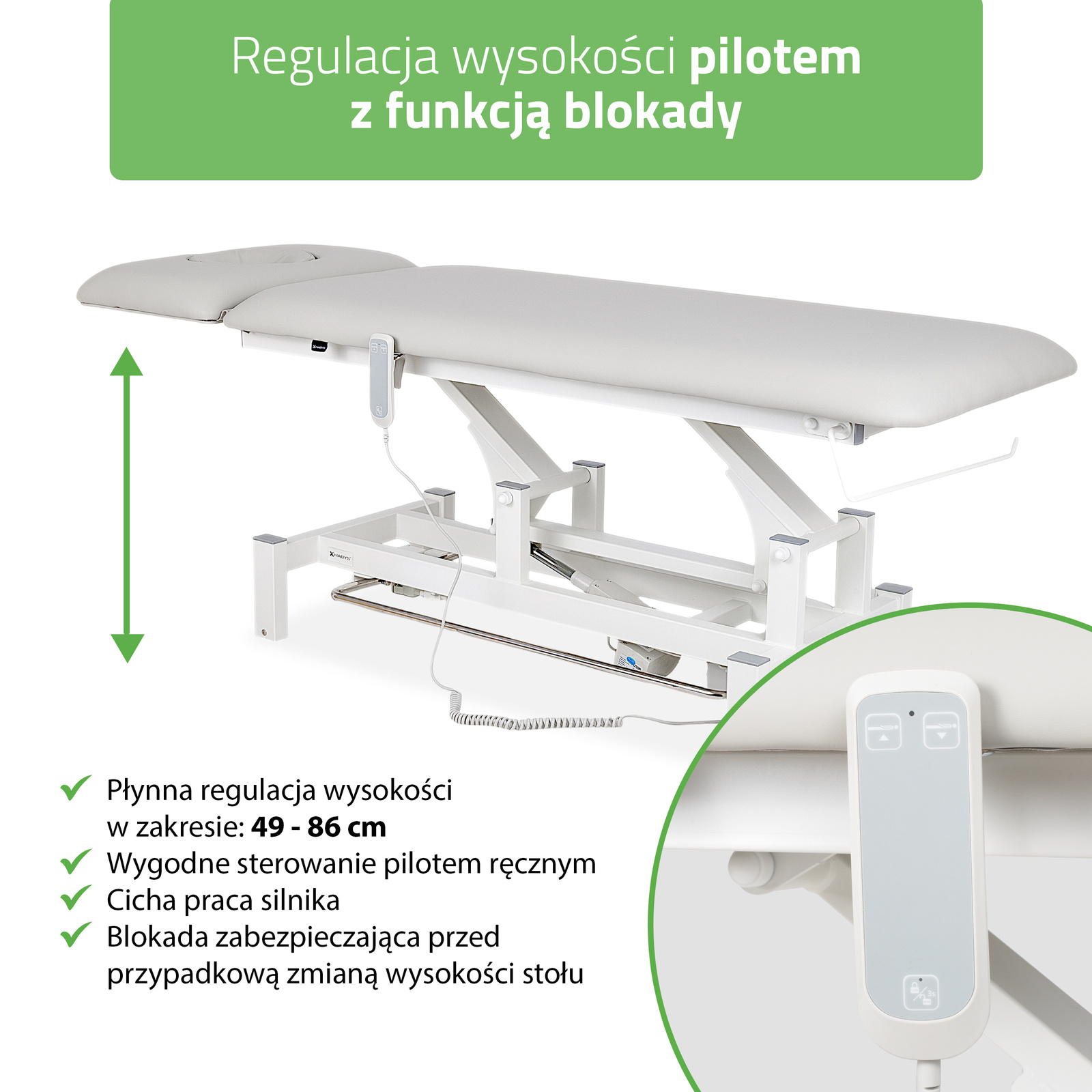 Elektryczna regulacja wysokości: Stół Fortis 2 ERGO wyposażony jest w cichy, certyfikowany siłownik elektryczny, który umożliwia precyzyjną regulację wysokości w zakresie od 49 cm do 86 cm, zapewniając komfort pracy terapeucie oraz wygodę pacjentowi.