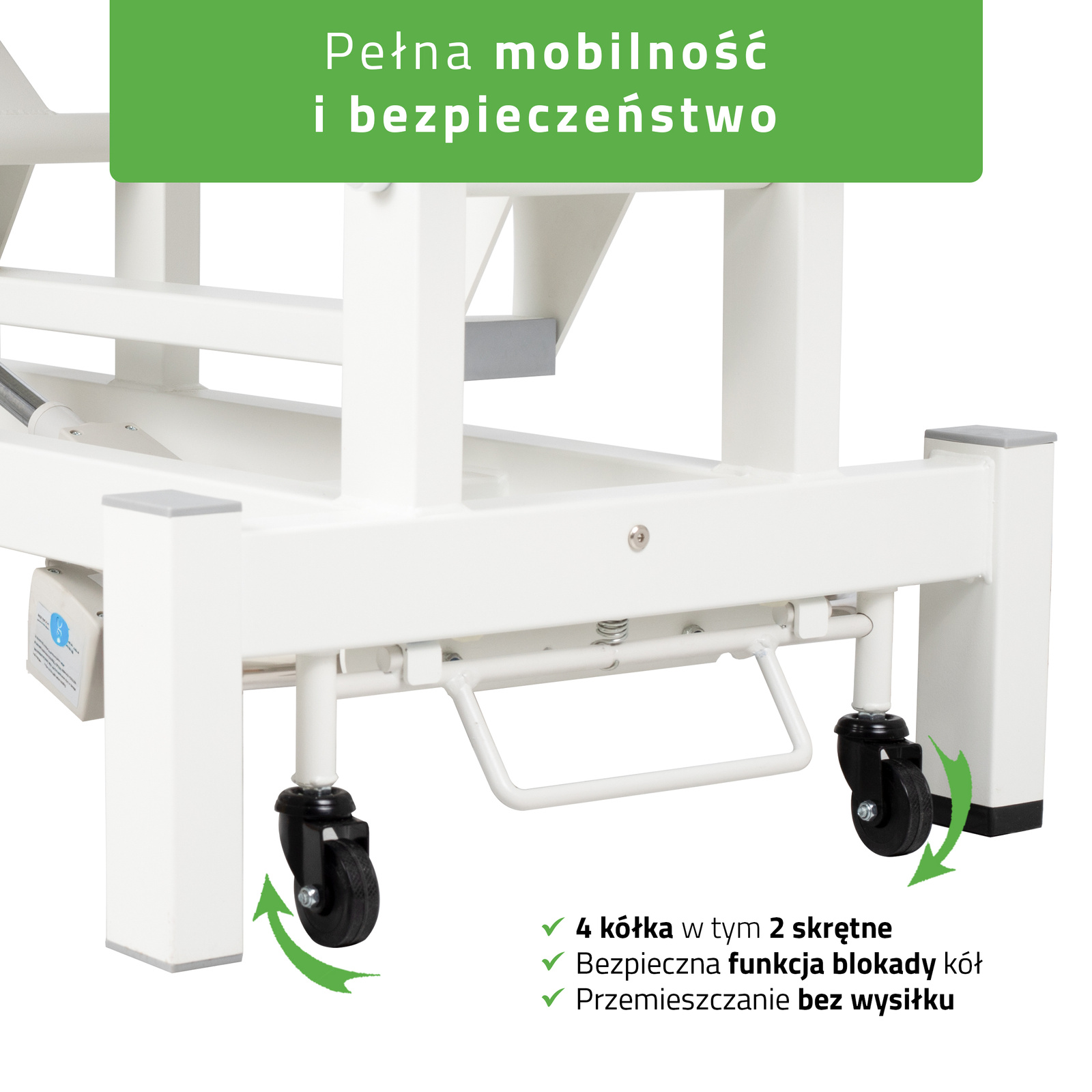 Wytrzymała konstrukcja: Zwiększona wytrzymałość ramy sprawia, że dopuszczalne obciążenie stołu wynosi 200 kg, co pozwala na bezpieczne użytkowanie nawet przy większym obciążeniu. Dzięki stabilnej konstrukcji stół jest odporny na drgania i przesunięcia podczas zabiegów.