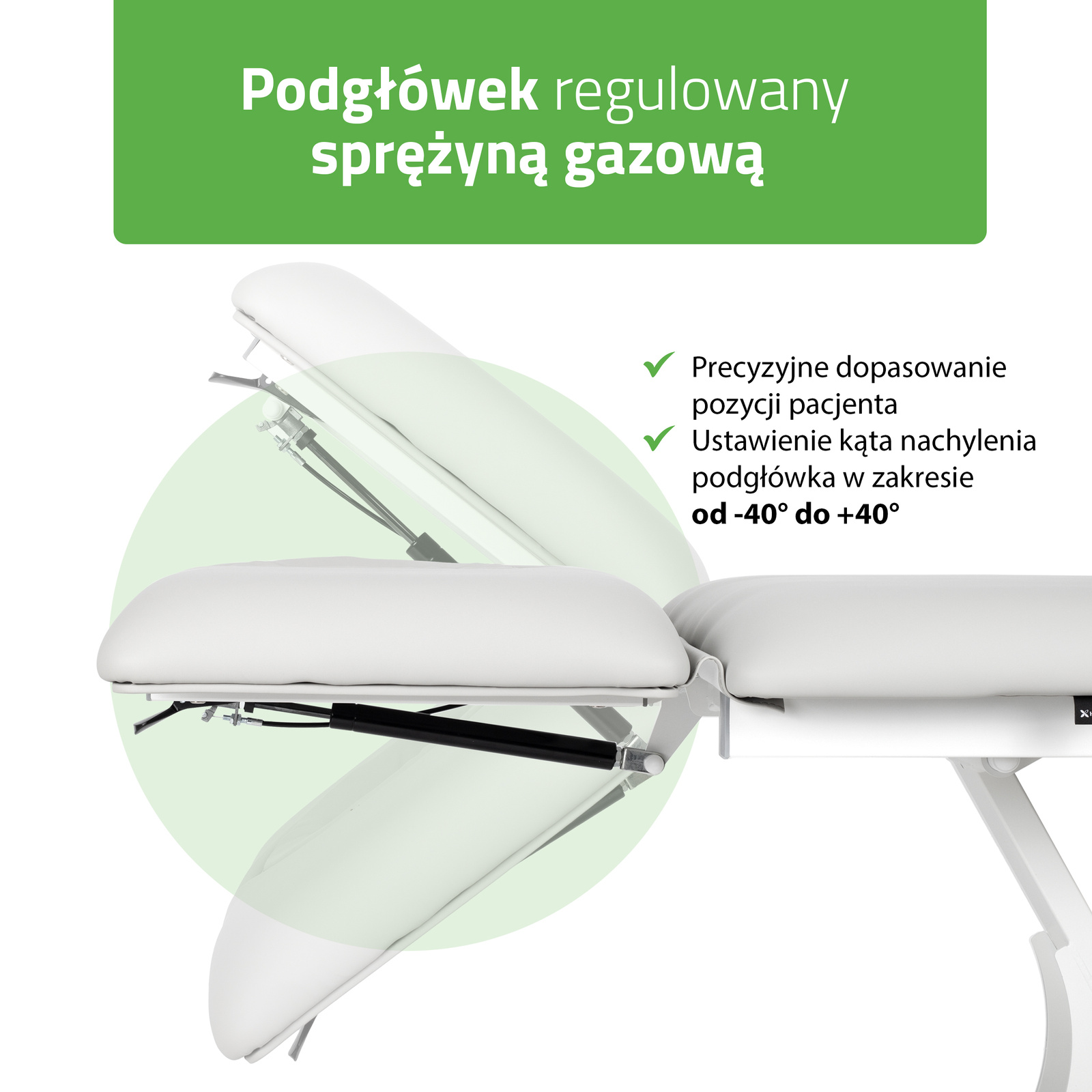 2-segmentowy blat: Komfortowe leżysko o wymiarach 192 cm x 68 cm składa się z dwóch segmentów: zagłówka i leżyska głównego. Regulowany zagłówek pozwala na dopasowanie pozycji pacjenta w części szyjnej kręgosłupa.