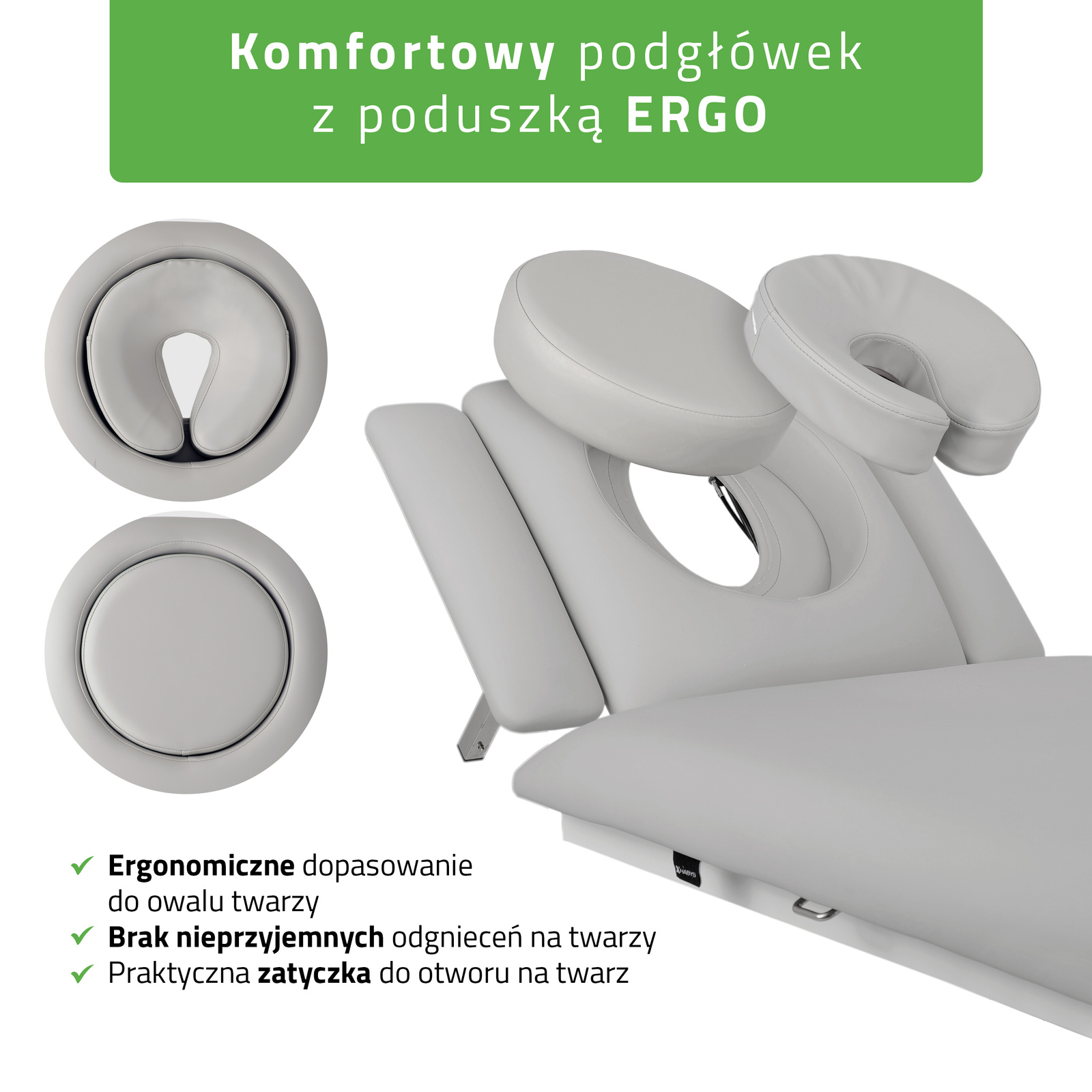 Podgłówek z poduszką ERGO: Regulacja kąta nachylenia podgłówka oraz mechanizm sprężyn gazowych zapewnia ciche i precyzyjne dostosowanie pozycji pacjenta do potrzeb w terapii. Poduszka Ergo odpowiednio miękka i komfortowa, specjalnie wyprofilowana i dopasowana do owalu twarzy zapewnia doskonały komfort dla pacjenta nawet podczas długiej terapii czy masażu.