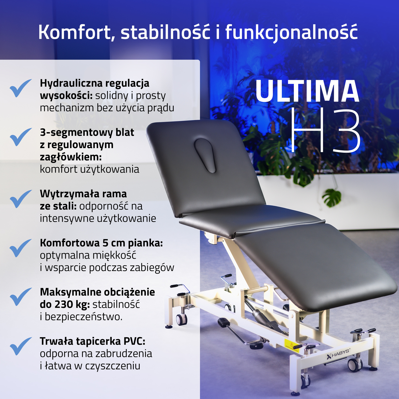 • Stół rehabilitacyjny ULTIMA H3 wyposażony w 3-segmentowy blat to sprzęt stworzony dla specjalistów z zakresu fizjoterapii, masażu czy rehabilitacji. Zapewnia pełną ergonomię i wyjątkową wygodę użytkowania.