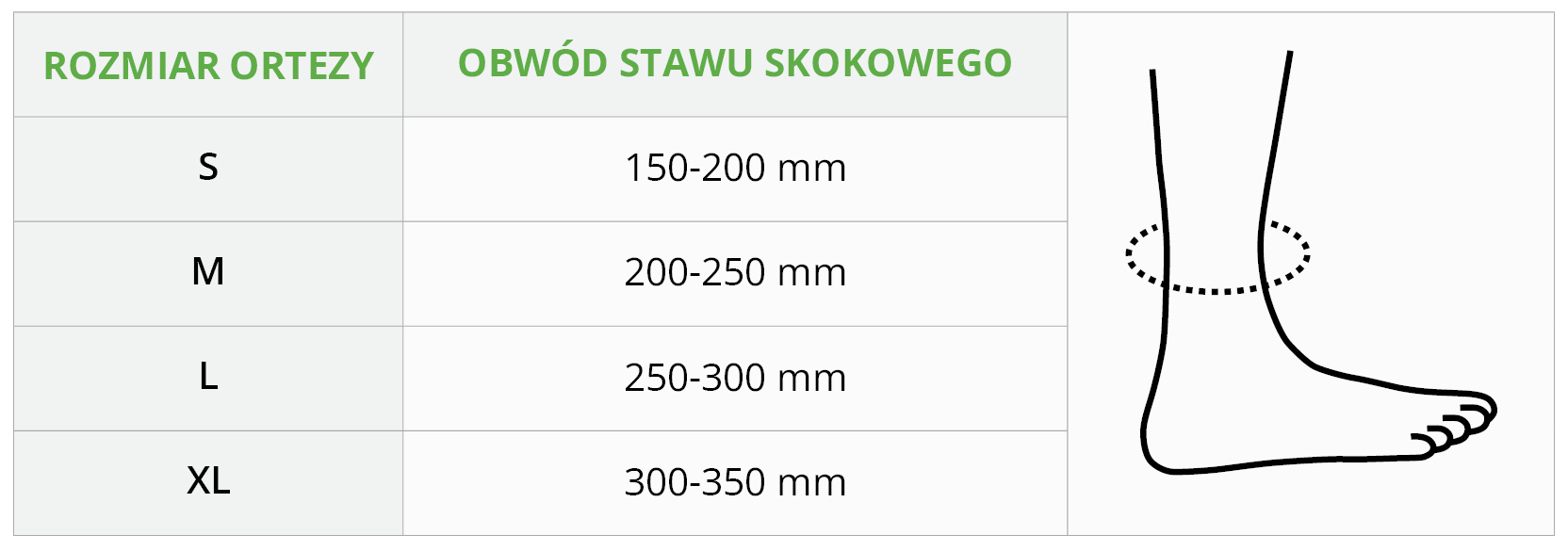W celu wybrania odpowiedniego rozmiaru należy zmierzyć obwód wokół kostki i wybrać odpowiedni rozmiar, kierując się tabelą rozmiarów.